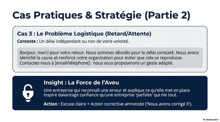 Le ton idéal est celui d'un professionnel qui prend au sérieux le retour d'un client, qui assume ce qu'il y a à assumer, et qui propose des solutions concrètes. C'est le ton d'une entreprise mature, pas celui d'une entreprise qui panique.
