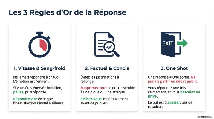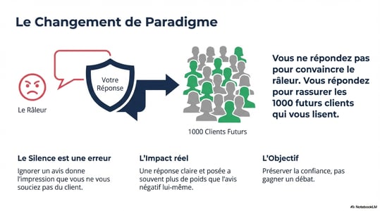 Le piège est double : non seulement vous donnez une mauvaise image, mais en plus, cette réponse restera en ligne pour toujours. Dans six mois, dans deux ans, de nouveaux clients la liront. Et ils ne verront pas votre frustration légitime : ils verront une entreprise qui s'emporte face à la critique.