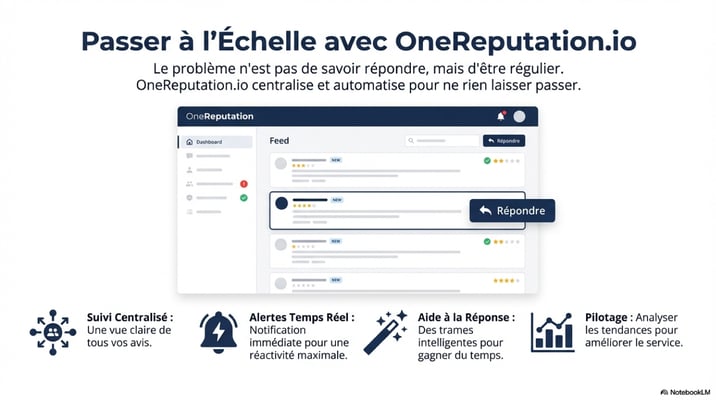 Les plateformes de gestion de réputation comme OneReputation.io permettent de centraliser tous vos avis en un seul endroit, d'être alerté immédiatement d'un nouvel avis, de répondre plus rapidement grâce à des modèles intelligents, de piloter votre collecte d'avis positifs, et d'analyser les tendances pour identifier vos axes d'amélioration.