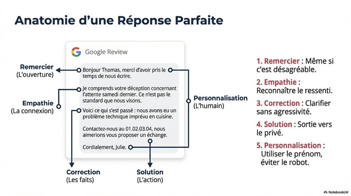 Une réponse efficace à un avis négatif contient toujours ces cinq éléments, dans cet ordre.