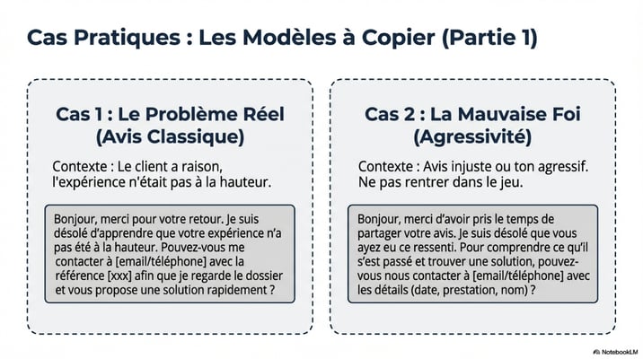 Certains avis ciblent un membre de votre équipe par son nom. C'est particulièrement délicat : vous devez protéger votre collaborateur tout en restant professionnel envers le client.